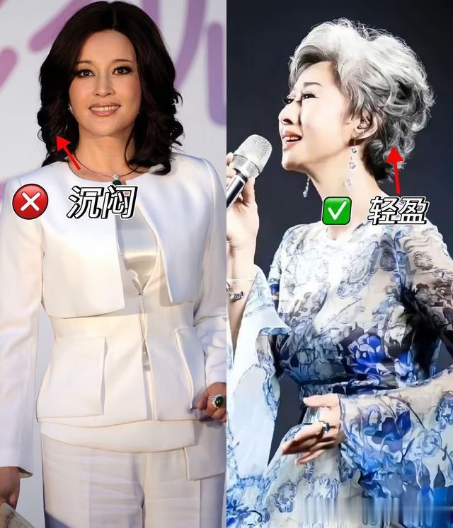 年纪大了,留着一头乌黑的头发,不但没有让你看起来年轻,反倒是因为黑发的量感太重,导致发型有压抑感,五官和气质的衰老感被放大,整个人都缺乏灵动感。对比下来,叶倩文的白发造型反倒是更优雅,白色的发色浅,它自带一种轻盈感,让气质都变得柔和了起来。